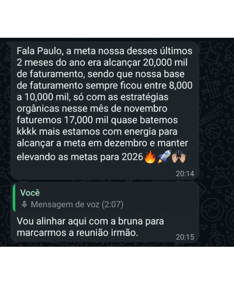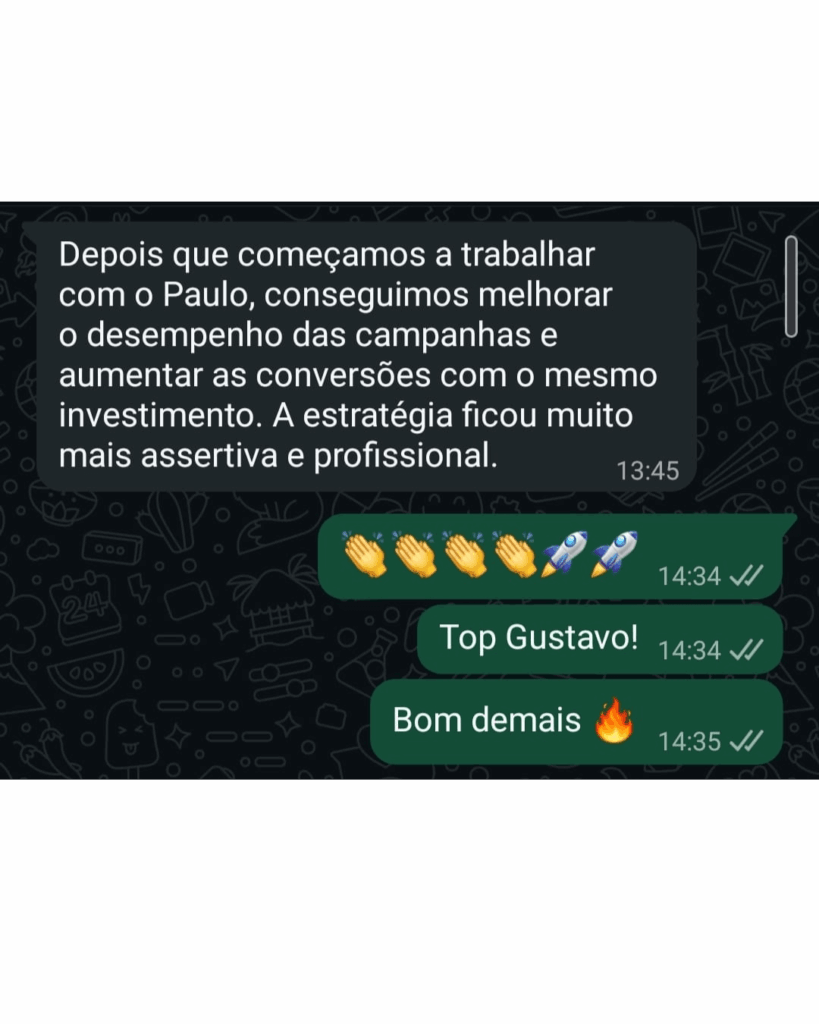 Meu nome é Paulo Vinicius, sou empresário, mentor, professor e palestrante. Nos últimos 8 anos já ajudei centenas de empresas à destravarem seus resultados, estruturando estratégias e orientando em ações práticas.